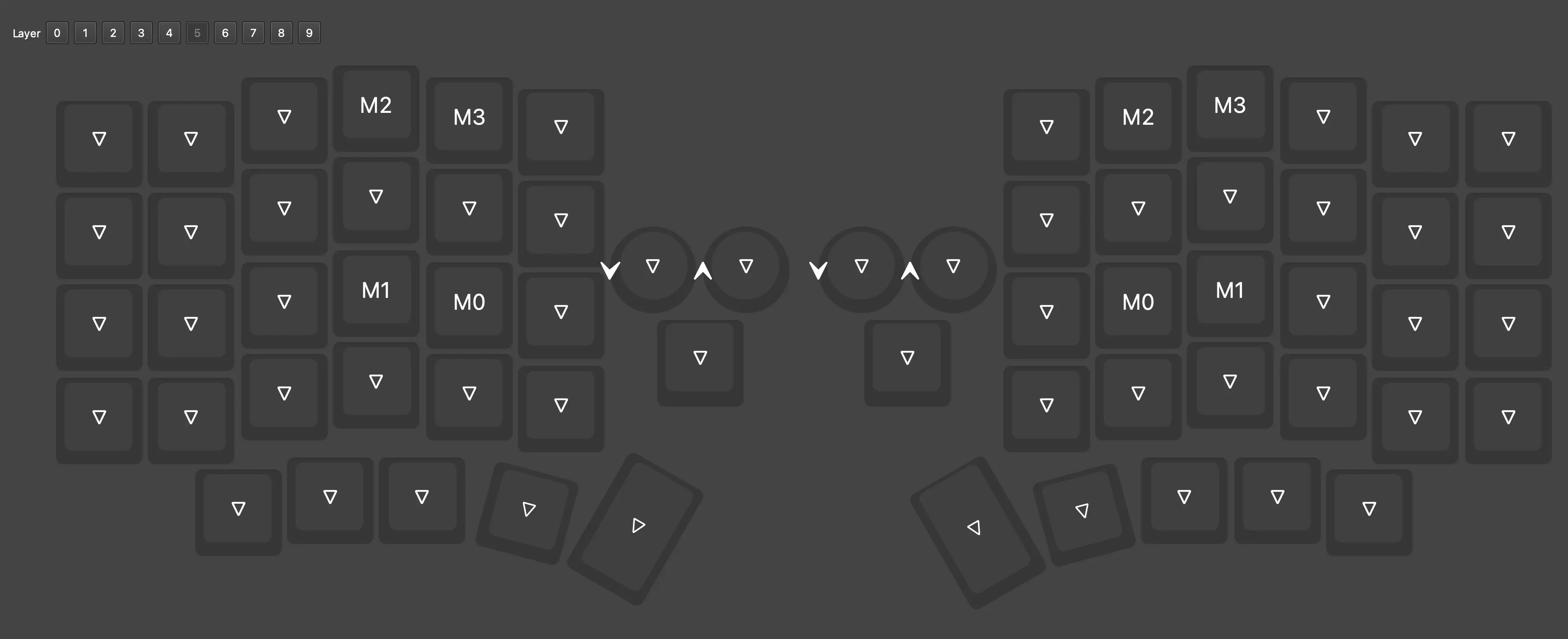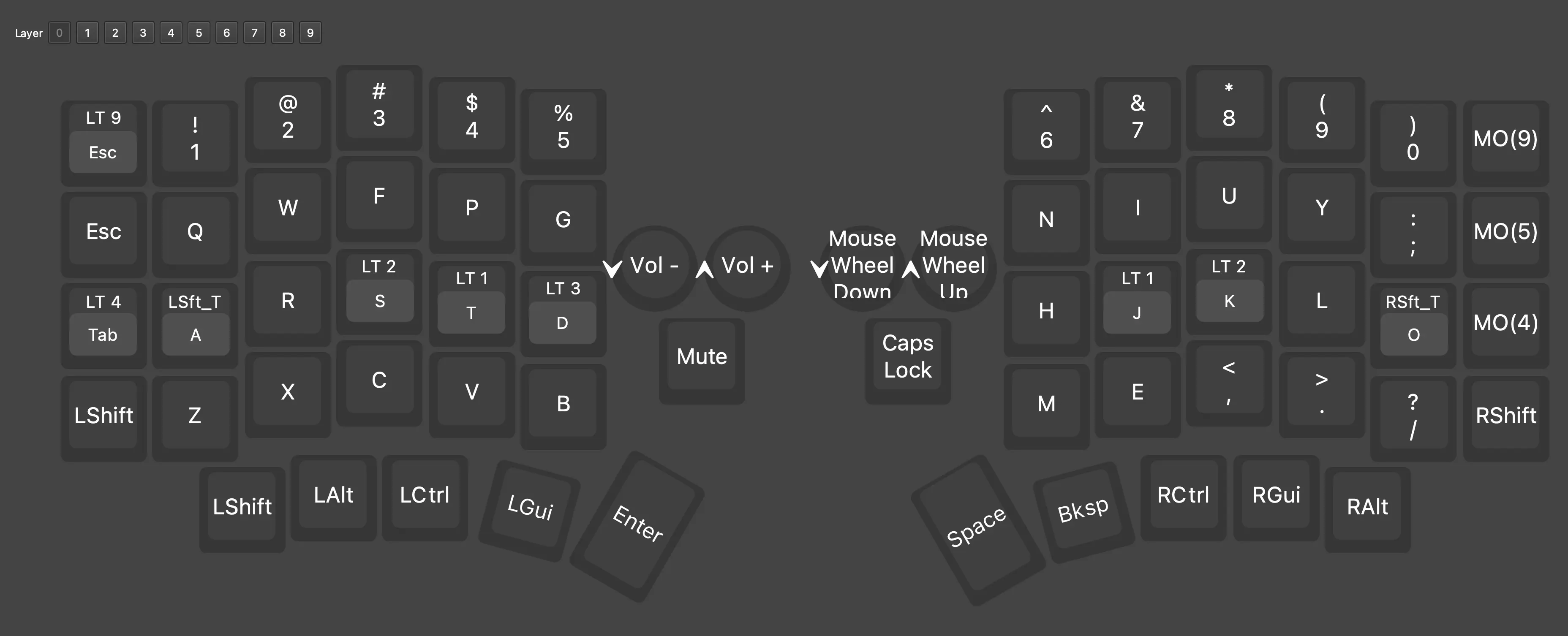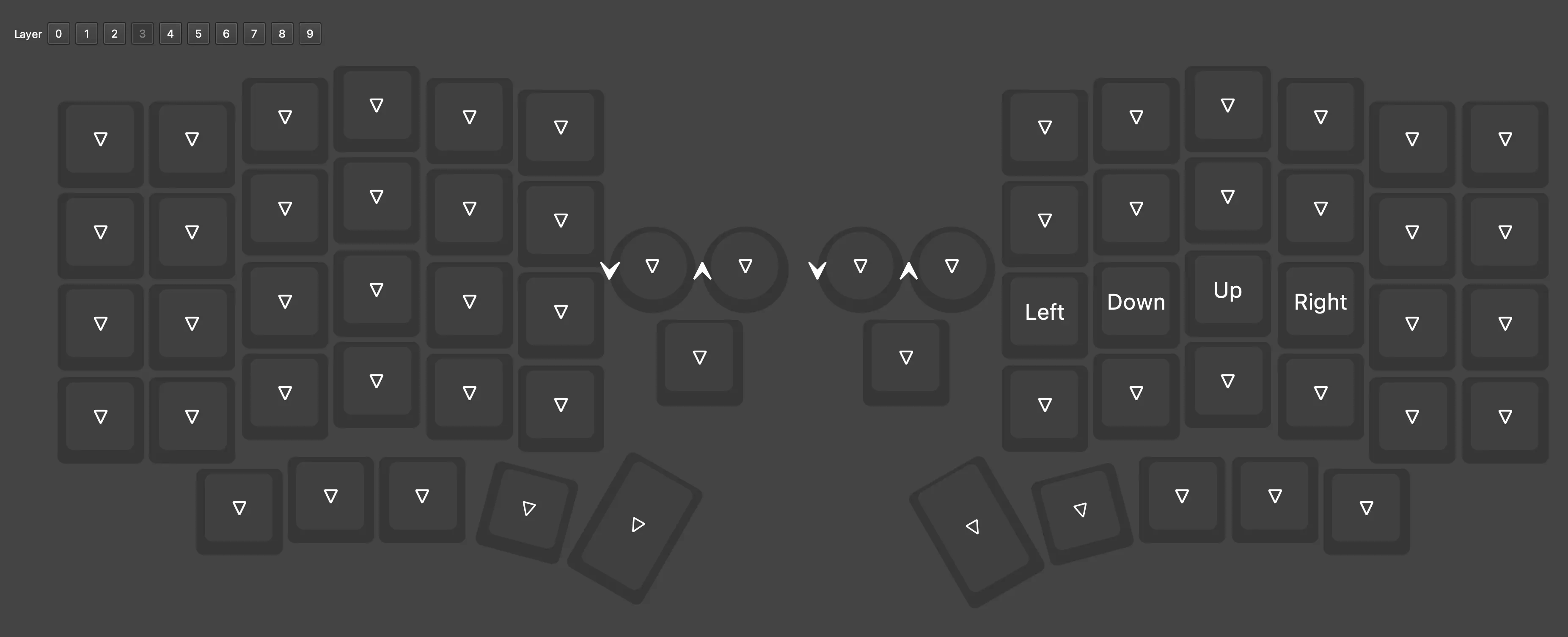 If you compare this to Layer 0 you can see that is almost looks the same, except some keys on the right half, namely the homerow. I am an avid Neovim user btw, which means for navigation I use HJKL. This was on the left homerow before and as I was learning a new layout anyway, this change meant nothing in terms of hindering on typing speed but enabled me to not relearn the most basic navigation in my editor. I also use homerow modifiers, which means I can tap the ‘A’ key for example for a simple ‘A’ press, but if I hold the key down, it is mapped to shift. The same principle applies to keys ‘S’, ‘T’, ‘D’, ‘J’, ‘K’, ‘O’ and on the left side ‘Tab’ and ‘Esc’. The Thumb cluster (thats how the keys at the bottom are called) is well utilized. The bigger keys are used for the common operations ‘Enter’ and ‘Space’, next to ‘Space’ is also ‘Backspace’. This means the thumb now has a way bigger purpose than just pressing the Spacebar. The rest of the thumb cluster has all the modifier. All of this has the endgoal of making my fingers leave the homerow as little as possible.