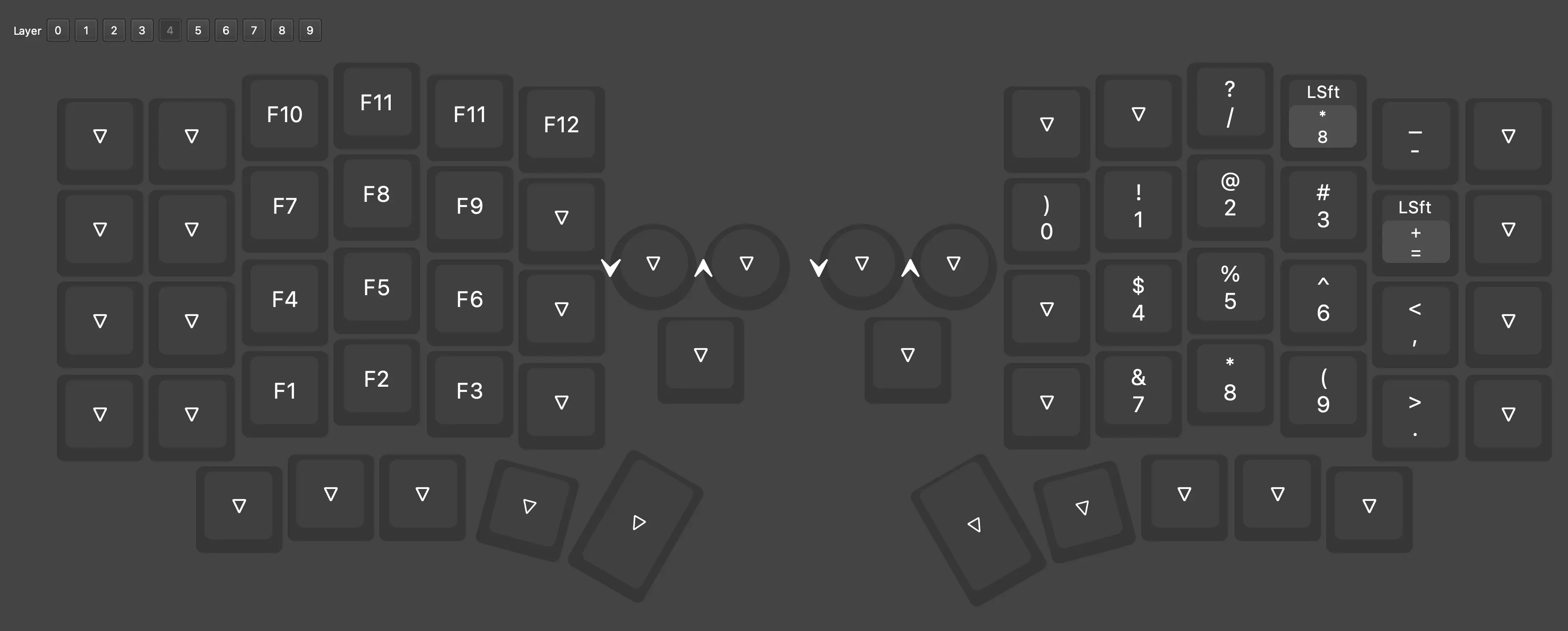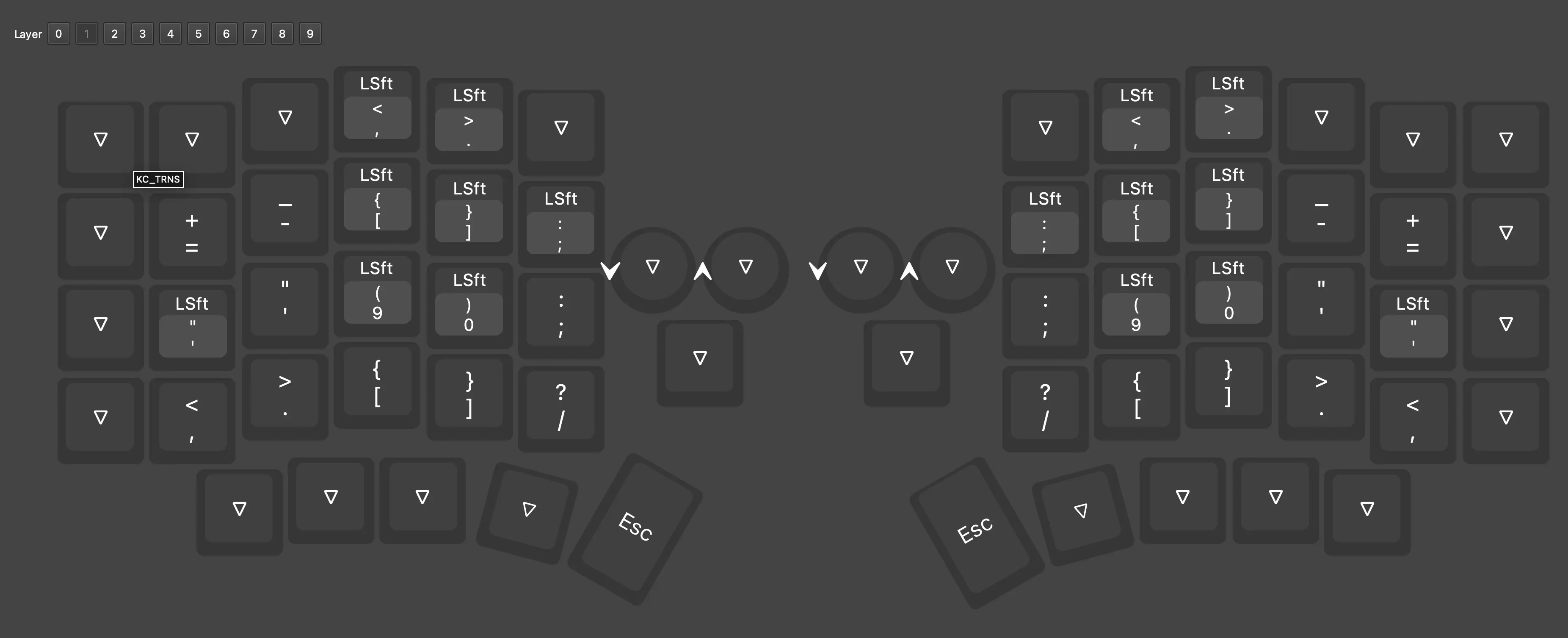 This is the first symbol layer. I have two because there are just so many different symbols and as a programmer they do get quite frequent to type. This layer focuses on the most used symbols and tries to group them together. It’s also more or less symmetric so I can activate the layer with either hand and have the other hand type the actual symbol. The index and middle finger on the homerow have the basic parenthesis as this is pretty much the most used symbol pair in programming (or at least in the languages I use). To get the other types of brackets I use the same fingers and just move them up or down. This logically couples the similar symbols to the same finger and I don’t have to do mental gymnastics to create an array. The other symbols are pretty much just scattered around depending on what I thought how frequent I need them. The more often I need a specific key the closer I want it to my homerow. In practice I already found out that it is hard to predict and I will likely change this at some point.