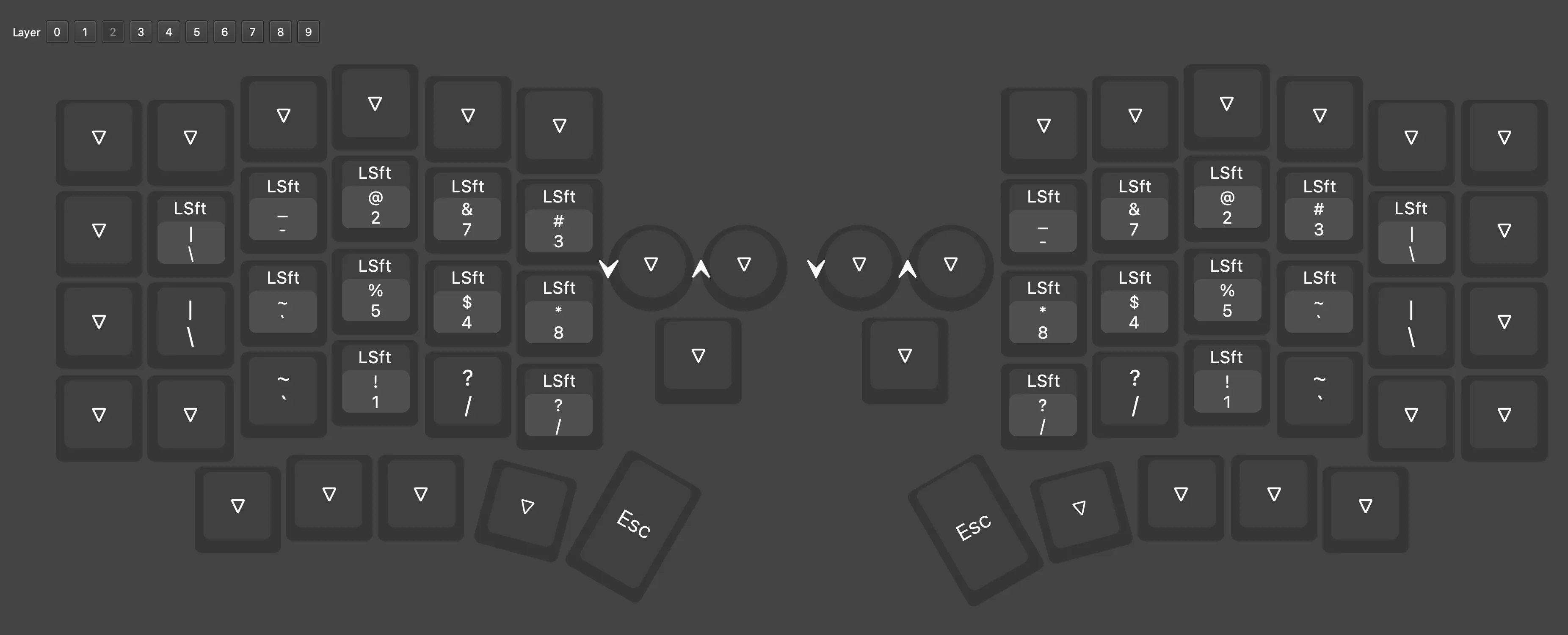 This is the second symbol layer and at it’s core follows the same thought as layer 1. This layer got added quite a bit later than the others so I am the least used to it’s key placement, which is even harder to learn as most of the symbols here are barely used in my day to day work. But this is just a bit more difficult to learn than the rest, not a big deal.