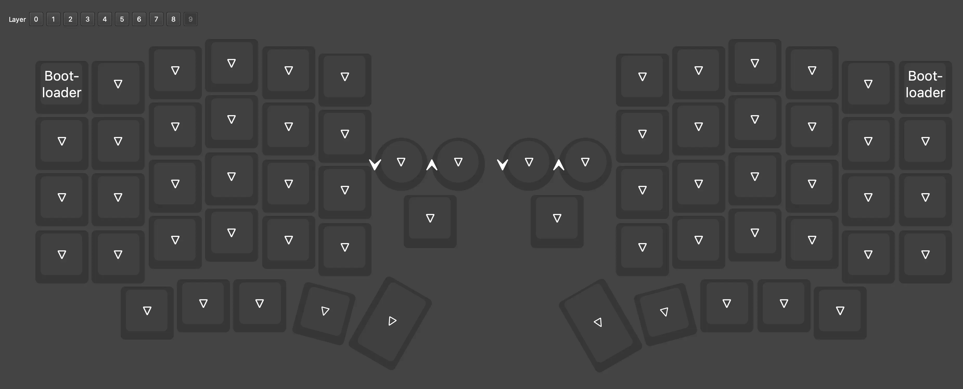 This is a special layer as it holds only the bootloader keys. Those are for the occassion that I want to re-flash the keyboard with a different firmware. I used this for example to change the behaviour of the LEDs to indicate what keys are active when a different layer is currently active. The positioning of them together with the layout key position means I always have to press both buttons, which also mimicks the default behaviour on some other firmwares/keyboards.
